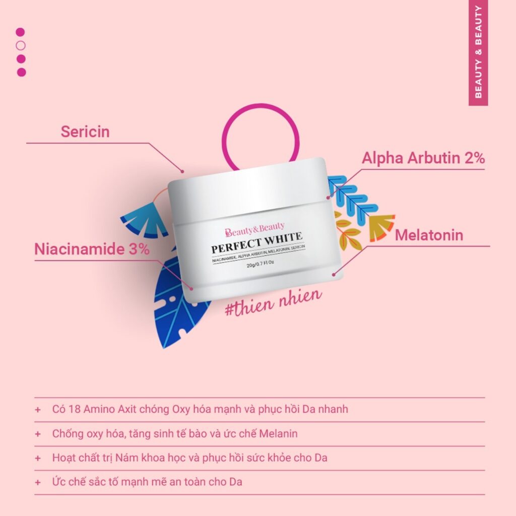 Nói đến sản phẩm trị nám nhanh và an toàn thì không thể bỏ qua kem Perfect White của Beauty & Beauty. Loại kem này được sản xuất theo tiêu chuẩn 3 in 1 . Vừa đào thải tế bào sừng nhiễm sắc tố, vừa ức chế sự hình thành Melanin cực mạnh thông qua cơ chế đều hòa gốc tự do, vừa tái tạo tăng sinh Collagen.