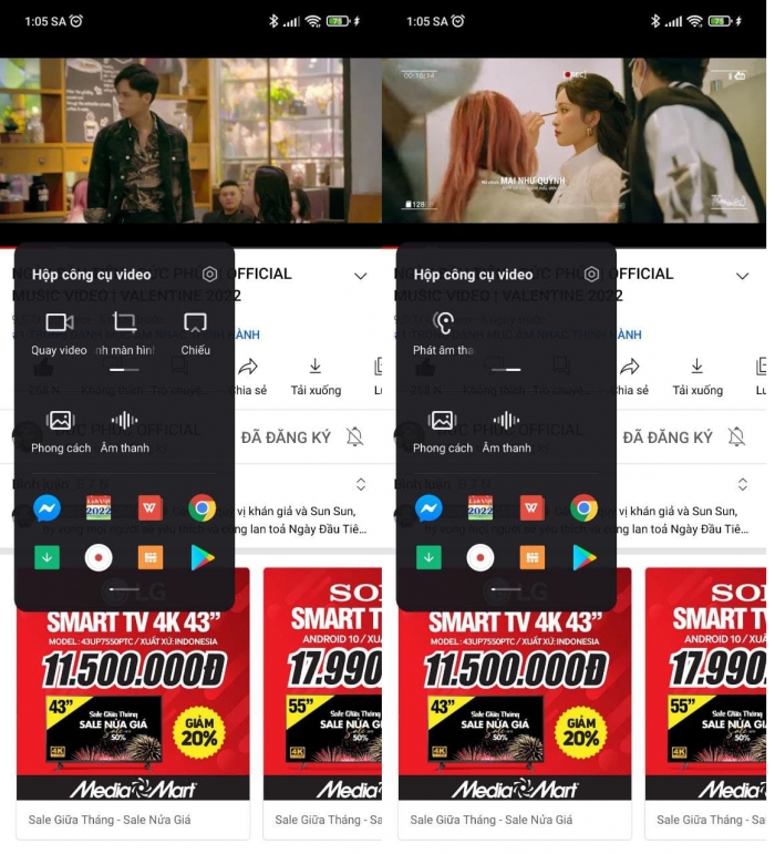 Cuối cùng, hãy vào Youtube và chọn một bài hát mà bạn yêu thích rồi mở Hộp công cụ video bằng cách gạt từ trái sang( sẽ có phần viền trắng hiện lên). Tại thanh các công cụ bạn hãy vuốt qua phải để có thể thấy được công cụ Phát âm với màn hình tắt.