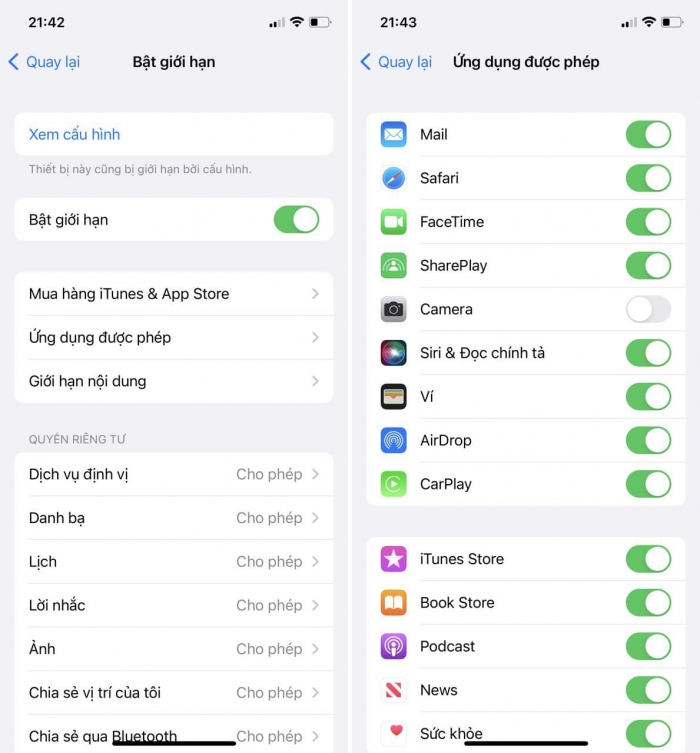 Cuối cùng, bạn chỉ cần chọn vào Ứng dụng được phép, sau đó nhấn nút tắt tính năng Camera đi.