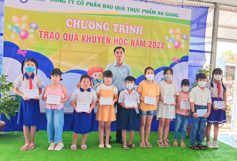 Phát biểu tại buổi trao quà, ông Nguyễn Huy Cường – Phó Tổng giám đốc Công ty Cổ phần Rau quả thực phẩm An Giang với tinh thần biểu dương, khen thưởng và chúc mừng kết quả học tập của các em trong năm học vừa qua.