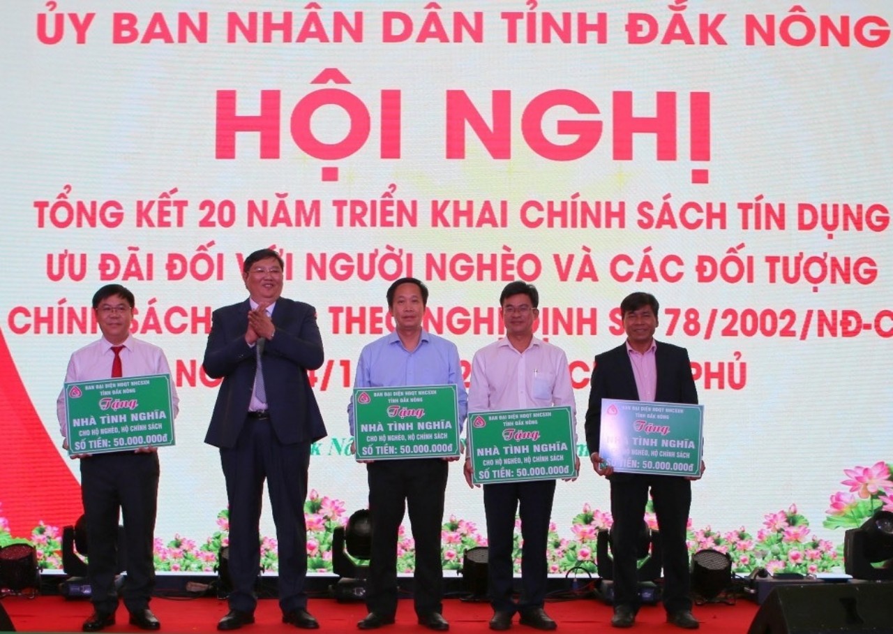 Nhân dịp này, nhiều tập thể và cá nhân được tuyên dương vì có nhiều đóng góp trong thực hiện các chương trình tín dụng chính sách ưu đãi trên địa bàn tỉnh Đắk Nông. Bên cạnh đó, ban đại diện Hội đồng quản trị Ngân hàng chính sách xã hội tỉnh đã trao 4 căn nhà tình nghĩa cho 4 hộ nghèo tại các huyện Tuy Đức, Đắk Glong, Krông Nô và Đắk Song.
