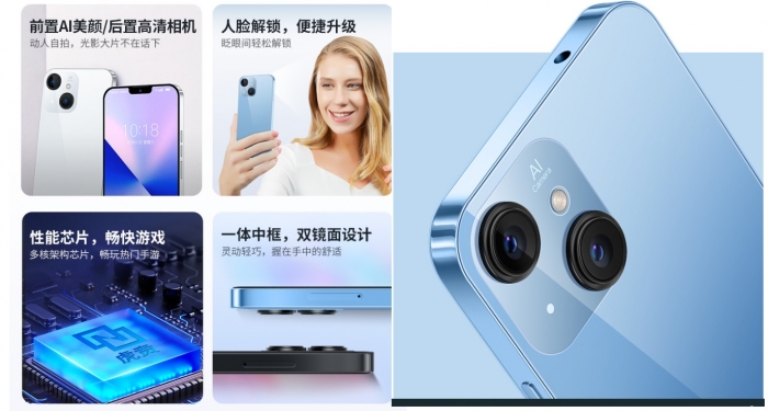 Chiếc smartphone giống hệt iPhone 13 có một màn hình LCD 6,54 inch với độ phân giải HD + 720 x 1560 px. Ngay cả ở mặt truowcsm nó cũng khá giống với iPhone 13 khi có cả phần notch hình tai thỏ.