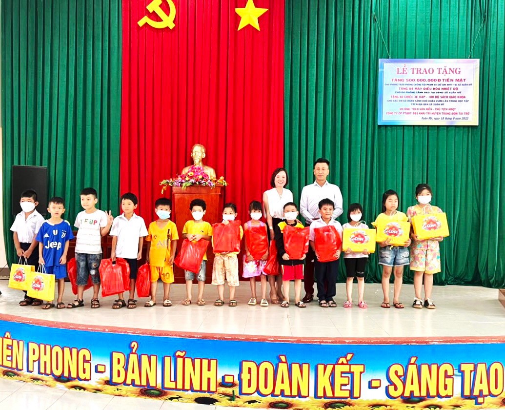Đại diện Công ty và Lãnh đạo địa phương trao quà cho các em học sinh tại xã Xuân Mỹ, Cẩm Mỹ