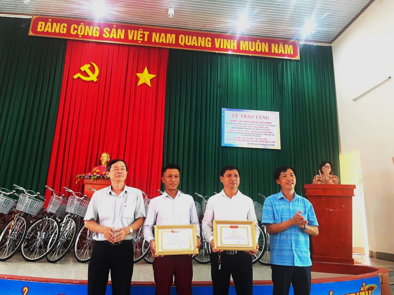 Ngoài ra, đại diện công ty còn trao những phần quà ủng hộ cho địa phương trị giá 110.000.000 (Một trăm mười triệu đồng) gồm: 100 bộ sách giáo khoa cho các bé đến trường, 40 chiếc xe đạp cho các em học sinh nghèo, khó khăn biết vươn lên trong học tập tại địa phương.