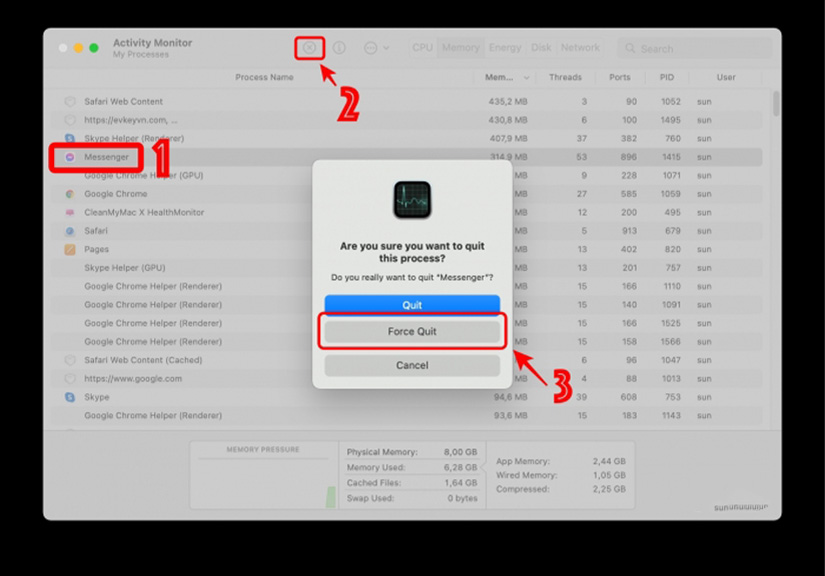 Cách 2: Mở ứng dụng Activity Monitor > Chọn ứng dụng khiến máy bị treo và nhấn vào dấu [X] > Nhấn Force Quit để tắt hoàn toàn ứng dụng trước khi tắt máy.