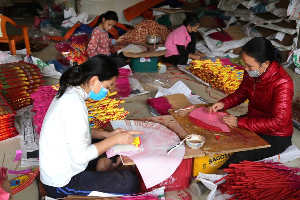 Trung bình mỗi ngày gia đình chị Lý cung cấp ra thị trường từ 5 – 7 nghìn thẻ hương các loại. Những ngày cao điểm như dịp áp Tết, từ 1 – 2 vạn thẻ. “Gia đình làm hương quanh năm nhưng dịp Tết Nguyên đán là mùa tiêu thụ hương lớn nhất trong năm. Gia đình sản xuất hương hoàn toàn bằng thảo mộc, nhờ đó nên có rất nhiều đơn đặt hàng. Để kịp bàn giao cho khách, gia đình tôi phải thuê 10 – 15 lao động làm liên lục, cả ngày lẫn đêm vừa để kịp nhập cho mối hàng quen, vừa nhập sang Lào”, chị Lý cho hay.