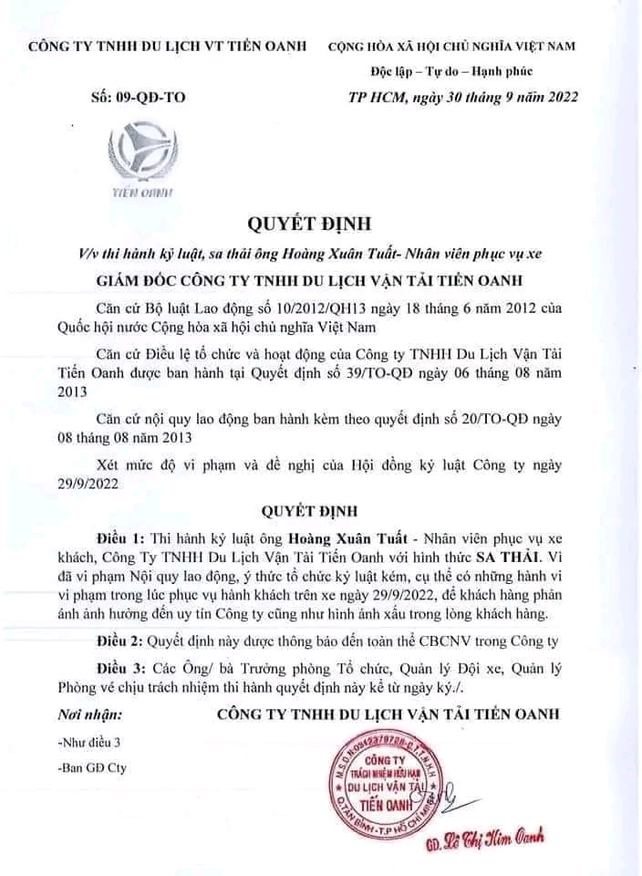 Quyết định sa thải nam phụ xe có hành vi khiếm nhã của công ty Tiến Oanh