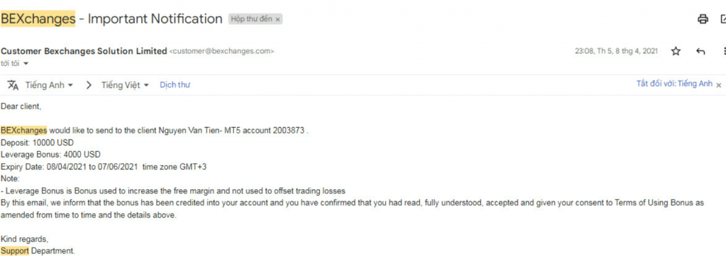 Sau khi TTV có loạt bài viết cảnh báo về Forex, thì PV tiếp tục nhận được phản ánh của anh Nguyễn Hoàng Minh cho biết: Đầu năm 2021, anh được một người có nick Zalo có tên Kim Ngân mời tham gia giao dịch Forex tại sàn Bexchanges. Ban đầu anh Minh từ chối, nhưng vì những lời mời “có cánh” là tham gia sẽ được khoản lãi cao, nên anh đã đồng ý.