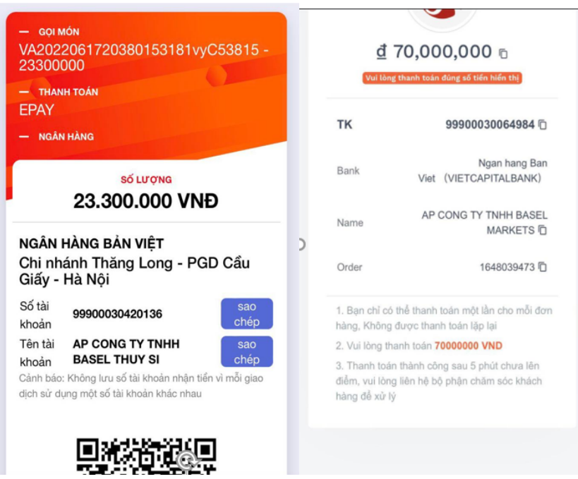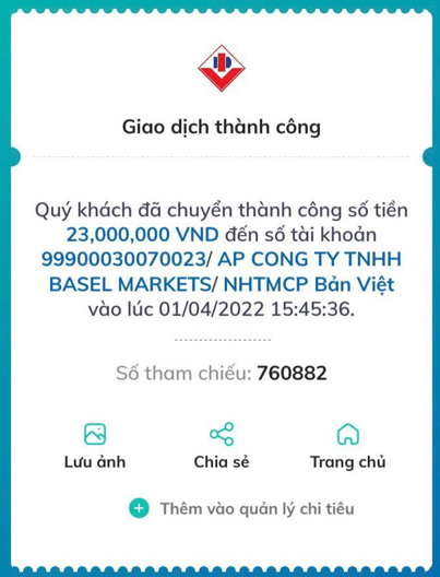 Đồng cảnh ngộ với chị M.P, anh Đỗ N.T cho biết: Anh đã mở 2 tài khoản tại sàn BASEL MARKETS và nạp tiền qua STK của Ngân hàng Bản Việt: 99900030064984, chủ tài khoản AP CTY TNHH BASEL THUY SI với tổng số tiền 26.300 USD. Tiếp đó, anh được nhân viên kỹ thuật của sàn hướng dẫn anh 2 lệnh của mã Mastercard và Tesla và cũng bị thua lỗ với số vốn 21.000 USD. Cũng nghi ngờ sàn BASEL MARKETS đã can thiệp vào lệnh trong thời điểm giao dịch, anh T liên hệ với nhân viên hỗ trợ giao dịch lệnh trước đó, nhưng nhân viên này tắt máy và không liên lạc được.