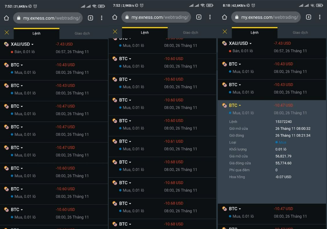 Tương tự, anh Tuấn – một nhà đầu tư khác cũng cho biết, sàn Exness tự động can thiệp vào tài khoản của anh. Cụ thể, tháng 11/2021, anh Tuấn tham giao dịch tại sàn Exness. Quá trình tham gia, anh không vô lệnh nhưng tài khoản thể hiện lệnh “lạ” và bị thua tiền. Sau đó, anh đã liên hệ lại với bộ phận hỗ trợ của Exness và sàn này đã có thông báo là IP 103.199.43.74 đã đăng nhập và phát sinh lệnh.