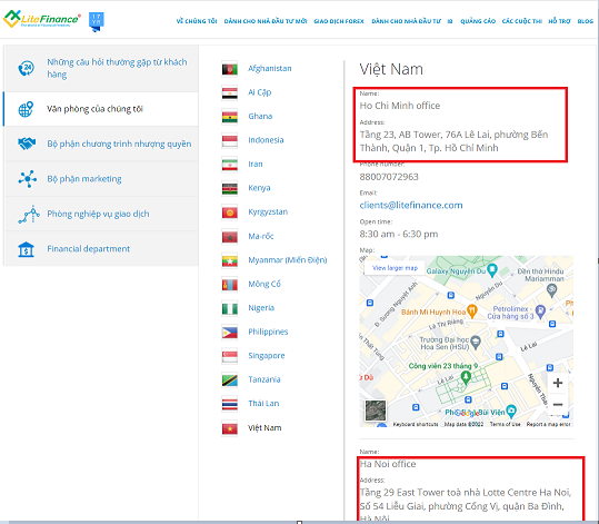 Trên Website https://litefinance-vi.com/ thể hiện sàn Lite Finance có văn phòng đại diện tại TP Hồ Chí Minh với địa chỉ tầng 23, tòa nhà AB Tower, 76A Lê Lai, P. Bến Nghé, Q.1 và Tầng 29 East Tower tòa nhà Lotte Centre Ha Noi, Số 54 Liễu Giai, P. Cống Vị, Q. Ba Đình, TP Hà Nội. Lần theo các thông tin trên, chúng tôi đến các địa chỉ và được lễ tân cho biết, tòa nhà không có Công ty hay sàn Lite Finance nào hoạt động cả.