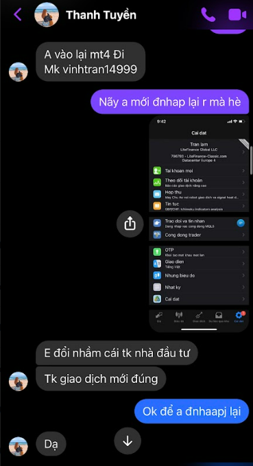 Đồng cảnh ngộ với anh V., chị Mai Thị Thanh T. chia sẻ: Chị được một người tên Trần Q.H. tự xưng là quản lý sàn Lite Finance nhắn tin qua Zalo mời tham gia đầu tư. Để tạo lòng tin, Trần Q.H. đã gọi video và đưa thông tin cá nhân của mình (CCCD số: 03609400xxxx, sinh năm 1994, quê quán Nam Định). Ngoài ra, Q.H. còn cho biết, chị T. chỉ cần đầu tư tiền, nhân viên sàn Lite Finance sẽ tự giao dịch và chị chỉ rút lãi thôi.