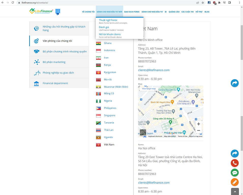 Thông tin trên Website https://litefinance-vi.com/ thể hiện có văn phòng tại TP.Hồ Chí Minh và Hà Nội