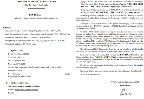 Bức xúc, anh Hoàng Chí Phú đã làm đơn tố cáo và đồng loạt gửi đơn cho Cục An ninh mạng và phòng chống tội phạm sử dụng công nghệ cao (A05) – Bộ Công An; Phòng Cảnh sát Hình sự (PC02) – Công an TP.Hồ Chí Minh… để tố cáo sàn Lite Finance có dấu hiệu gian dối, lợi dụng lòng tin nhằm chiếm đoạt tài sản.